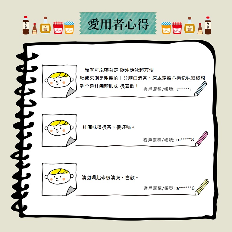 高果糖糖漿、桂圓萃取液 (水、桂圓)、蔗糖、黑糖粉 (蔗糖、糖蜜)、紅棗粉 (紅棗萃取液、辛烯基丁二酸鈉澱粉、焦糖色素)、枸杞粉 [枸杞、麥芽糊精、氧化澱粉(樹薯)]、香料、焦糖色素、甜菊醣苷 (甜味劑)。