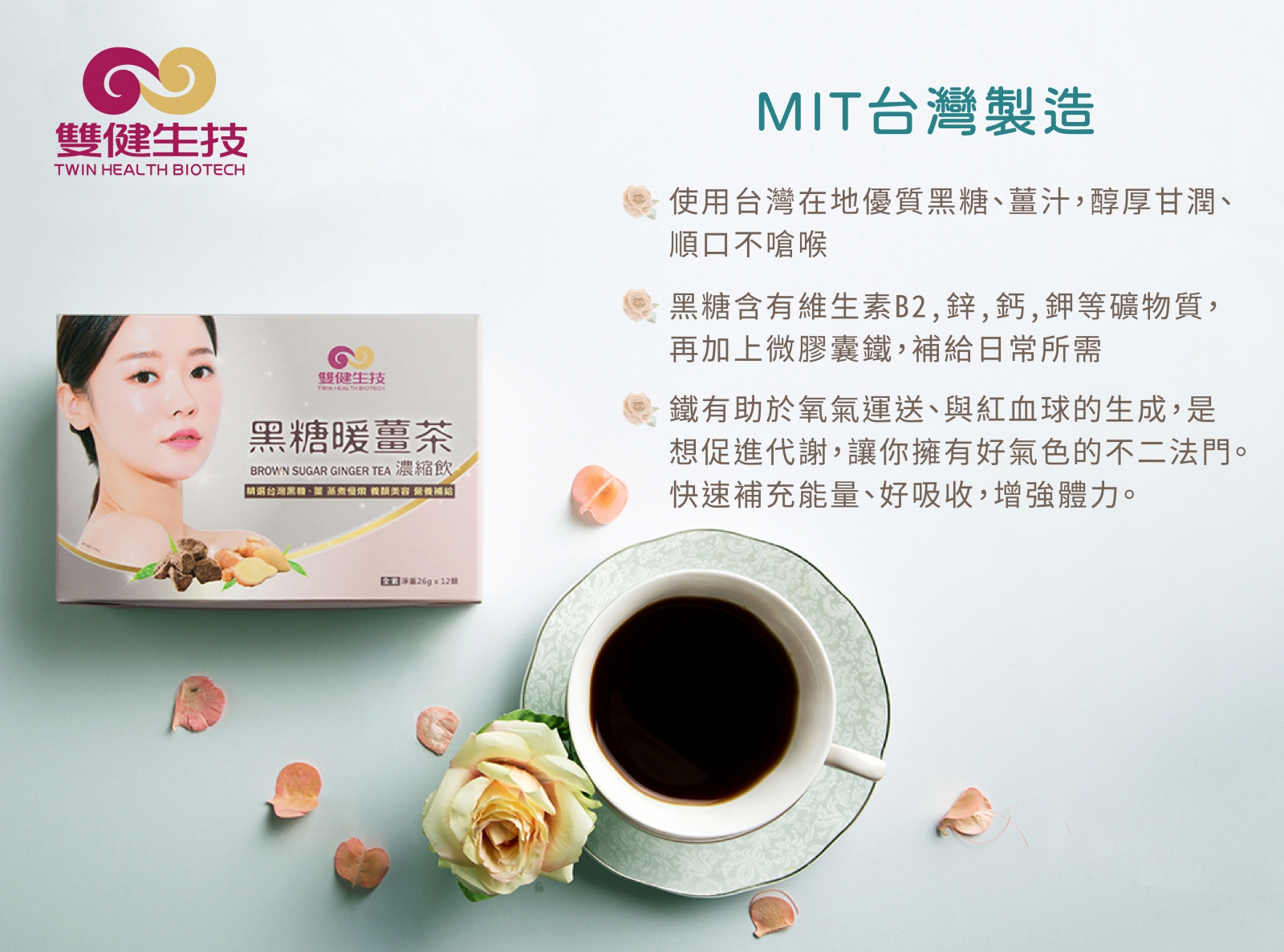 使用台灣在地優質黑糖、薑汁,醇厚甘潤、順口不嗆喉 ;黑糖含有維生素B2,鋅,鈣,鉀等礦物質,再加上微膠囊鐵,補給日常所需